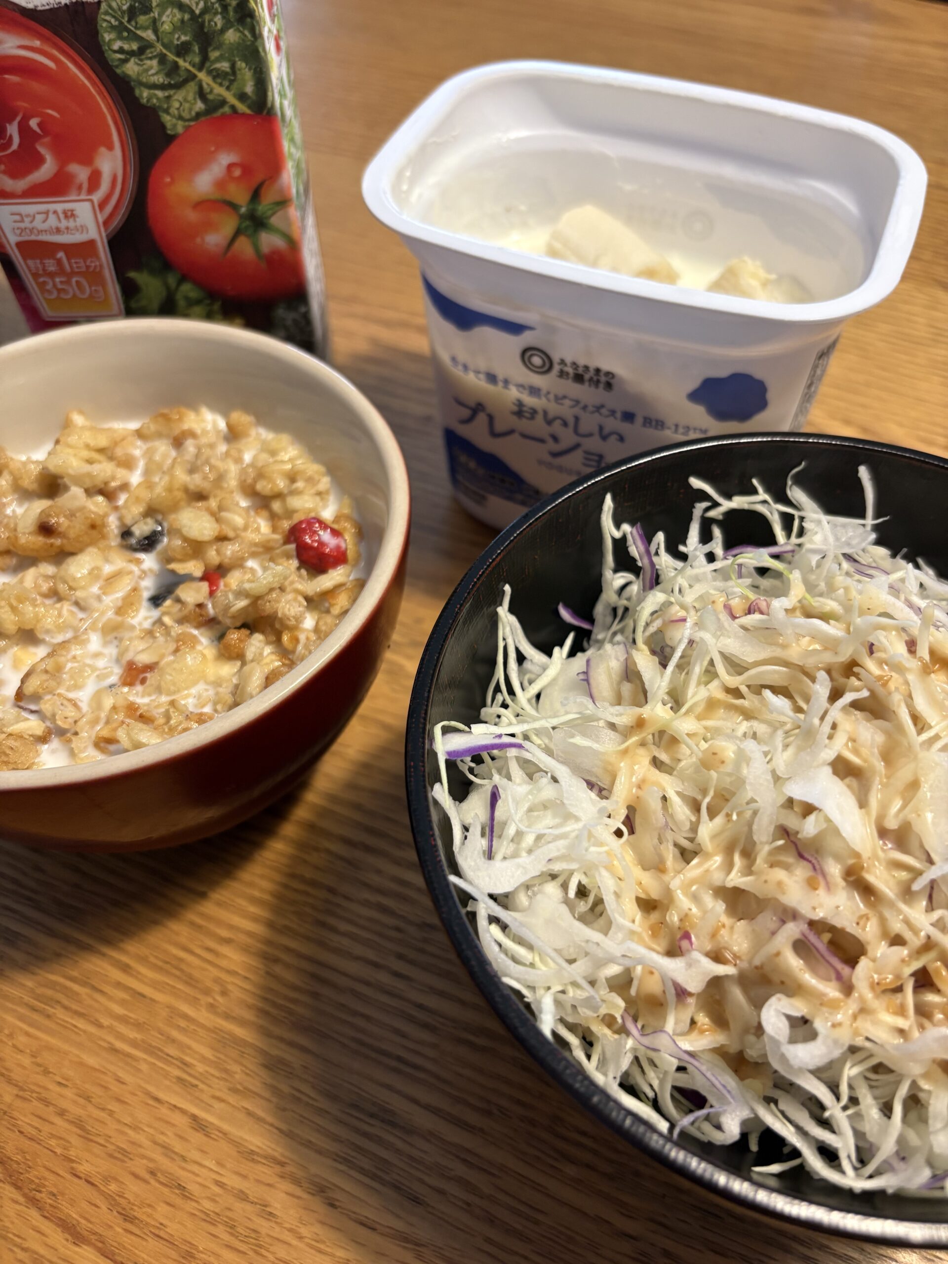 チアです。朝食は、フルーツグラノラとバナナヨーグルトと野菜ジュースがルーティンなのですが