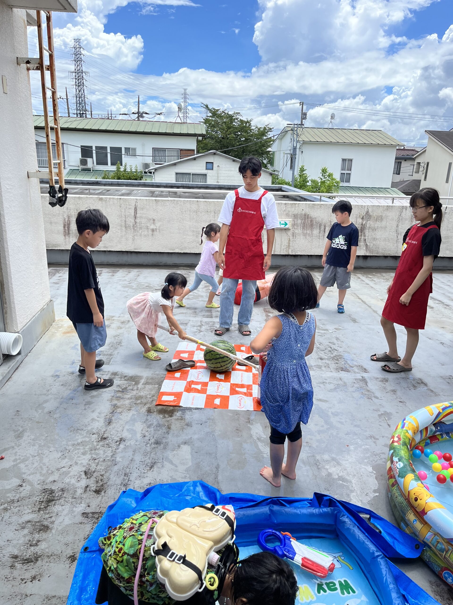 中高生が実施してくれたこども向け体験の、水遊びやスイカ割りは大きく盛り上がり