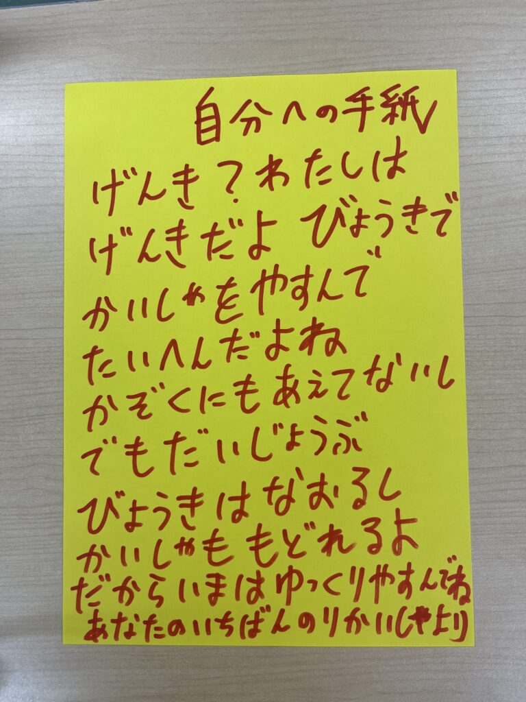 チアです。リハビリの一環で、「自分をいたわる」「自分を客観視する」というプログラムがあり