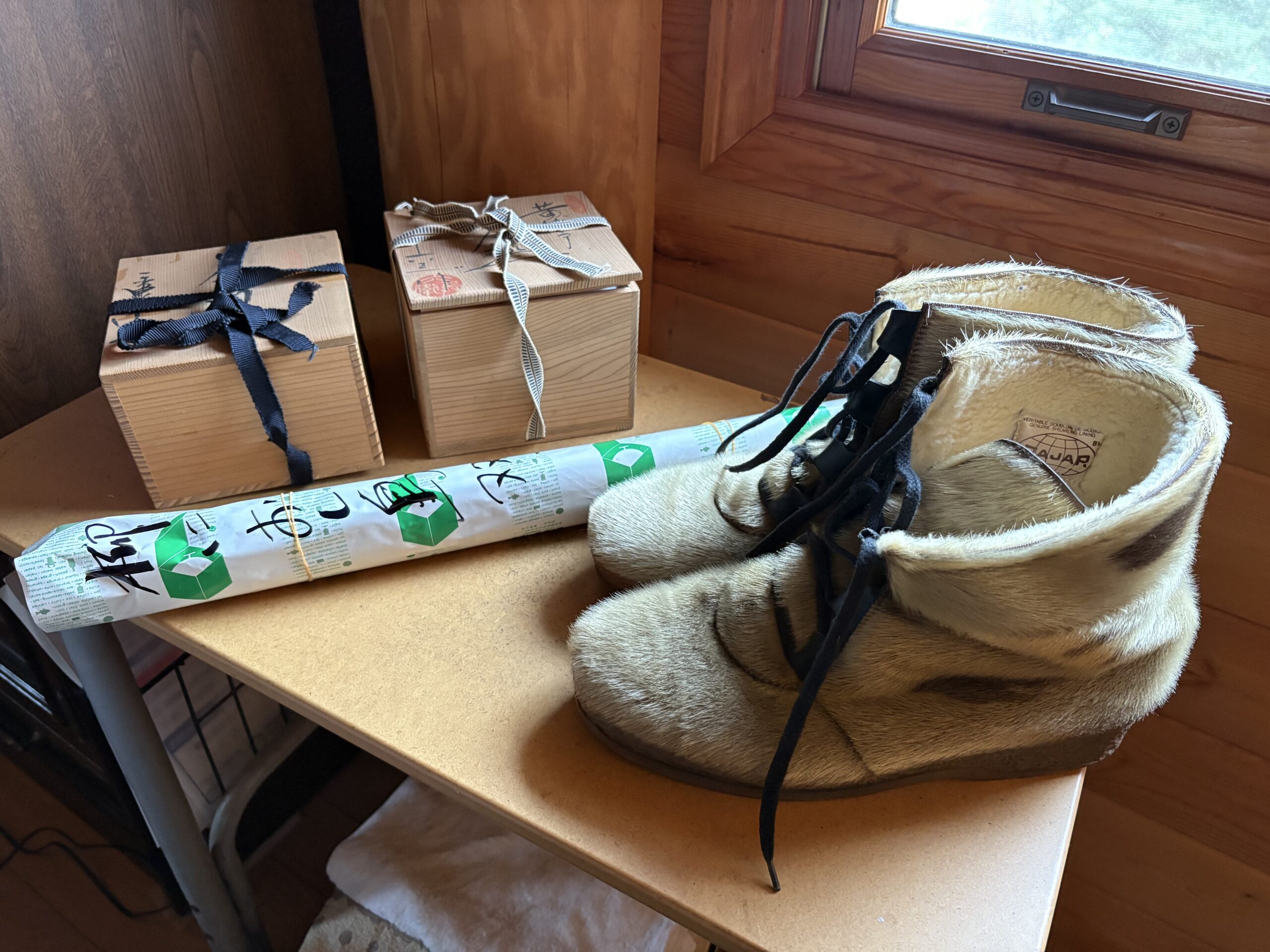 ①曾祖父の茶器「九谷焼」「瀬戸焼」 ②曾祖父の掛け軸「おしどり」 ③父がロシアで履いてたブーツ