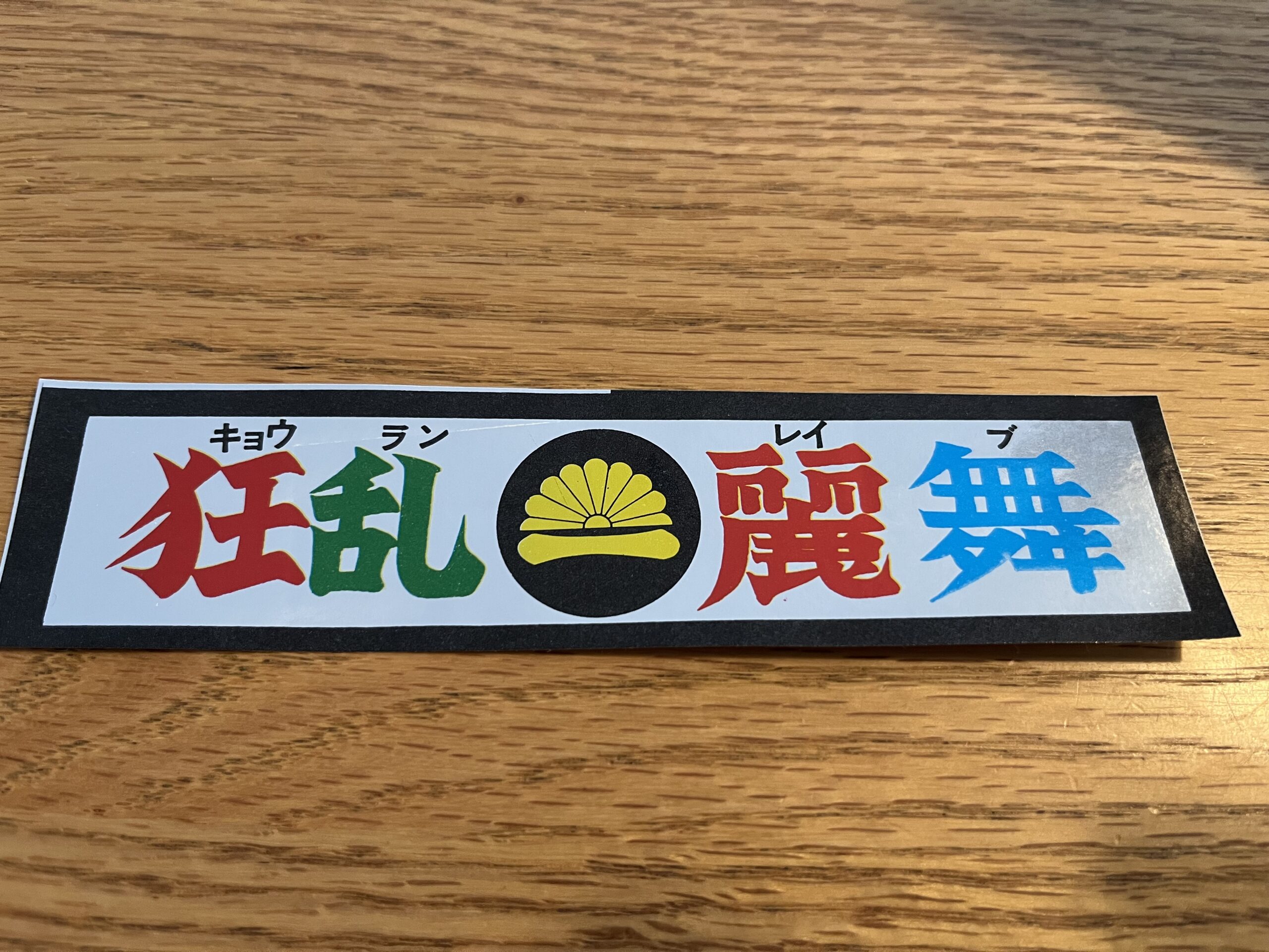 それがこれ、狂乱麗舞のステッカー。「俺らぁ、死んでも狂乱麗舞。。。」以上「特攻の拓」より。