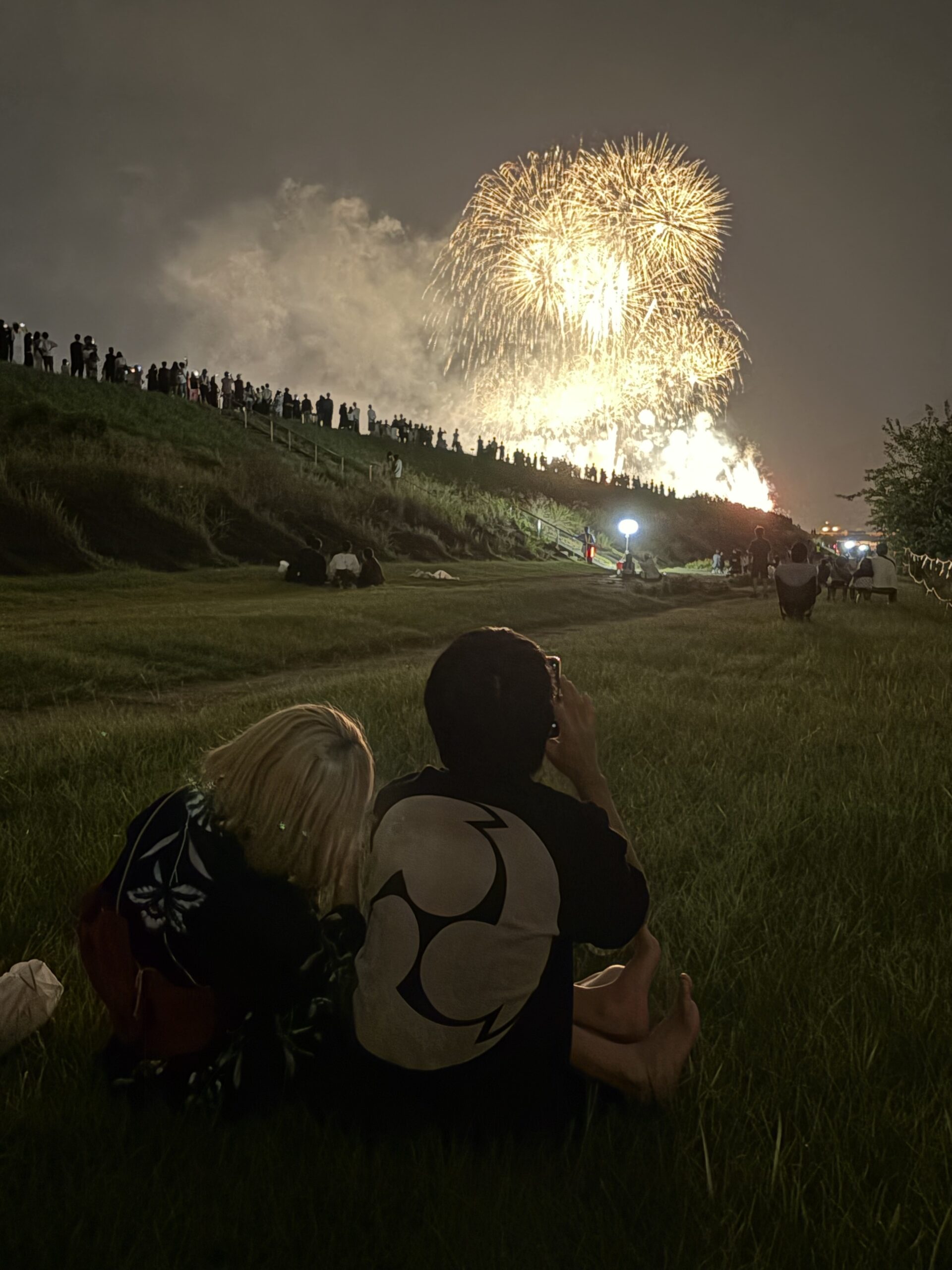 長良川の川原を歩きながら、打ちあがる花火を見上げています。