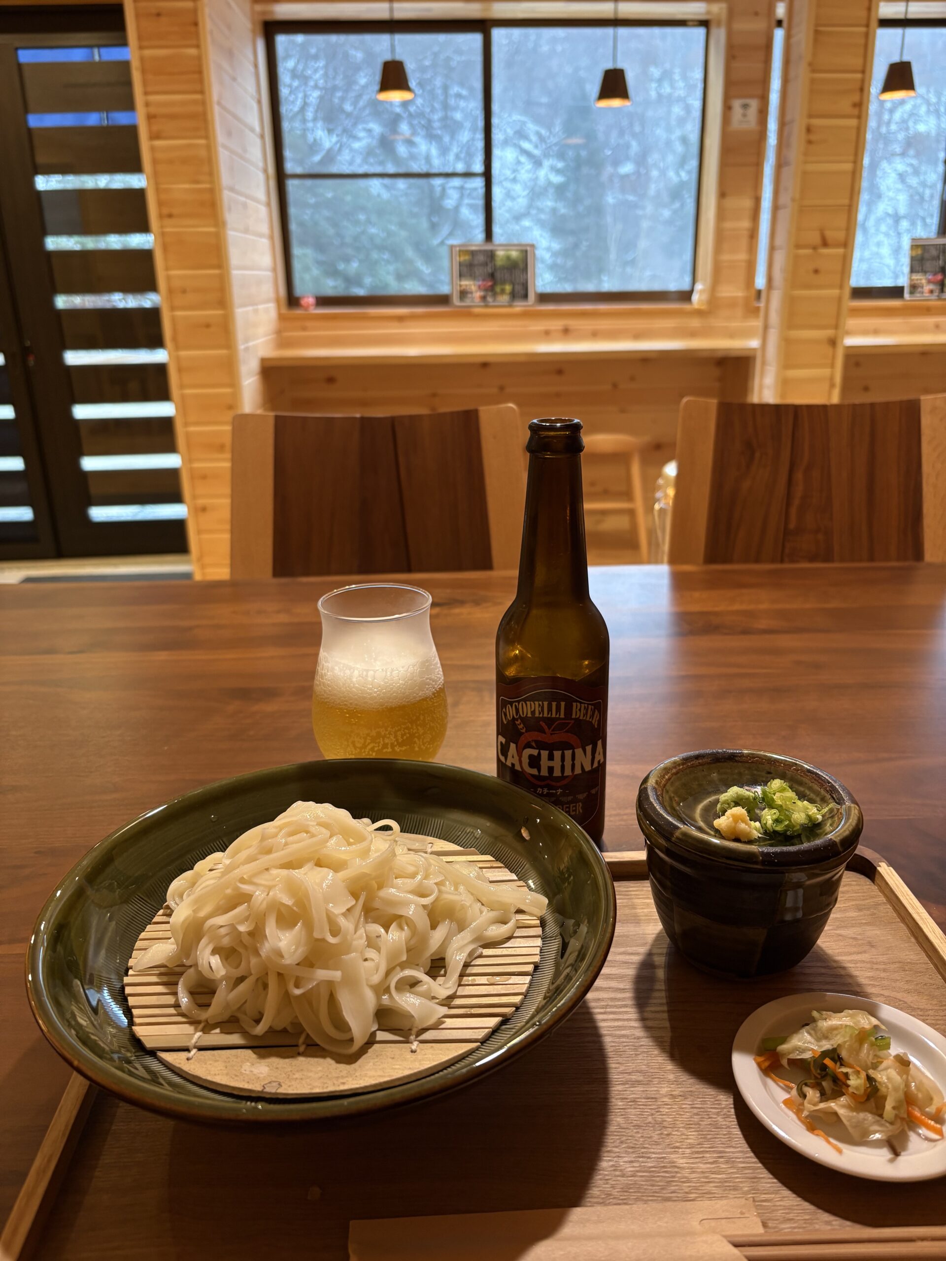 なめらかな喉ごしの平べったい麺を、地ビールと一緒に、外の雪を眺めつつ、頂きます。