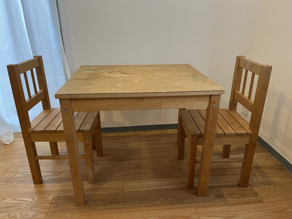 幼稚園、小学校低学年まで使っていた子供用の木製の机と椅子。