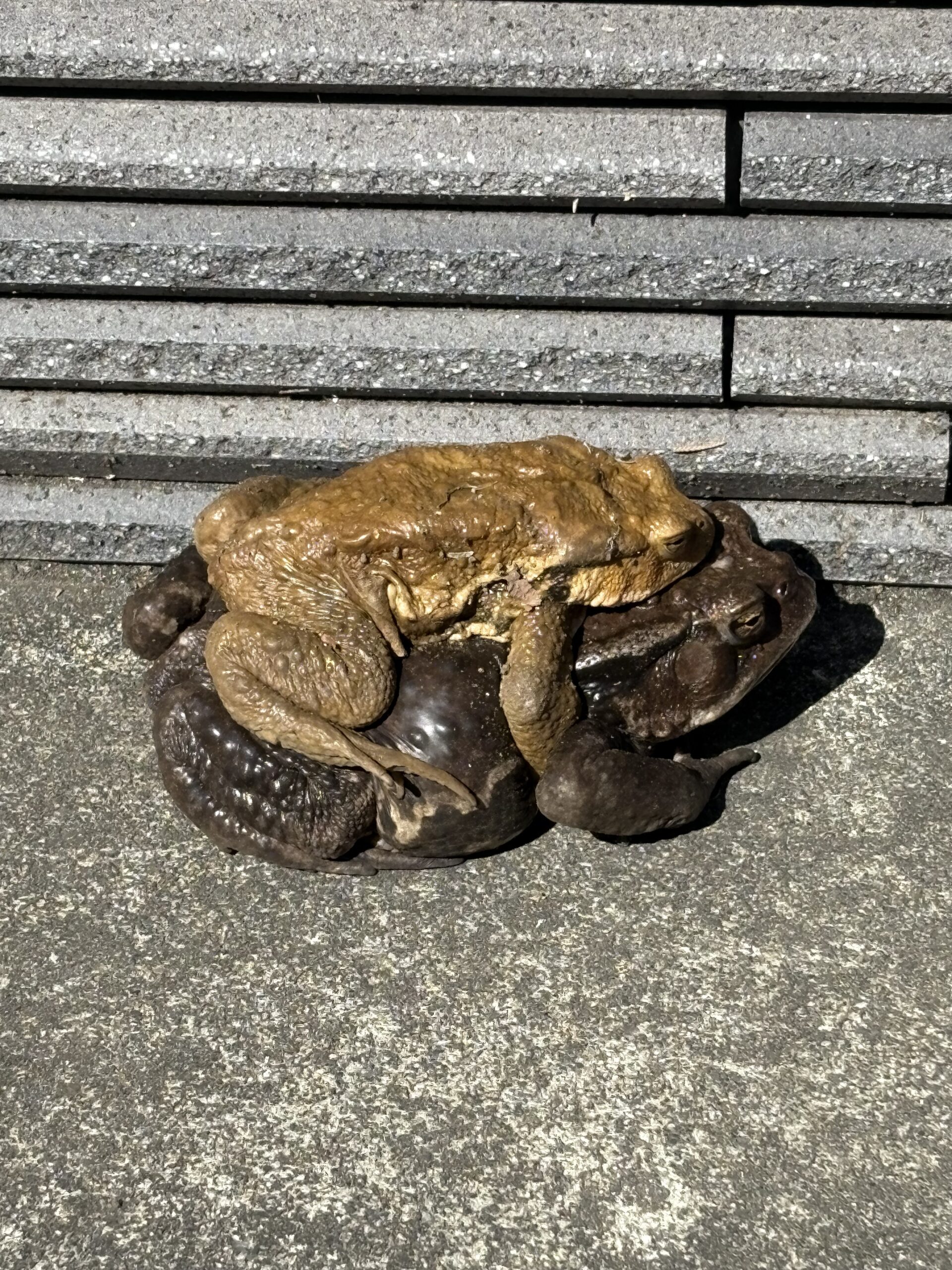 Cheerです。家の近所でカエルが仲良く抱き合っています。