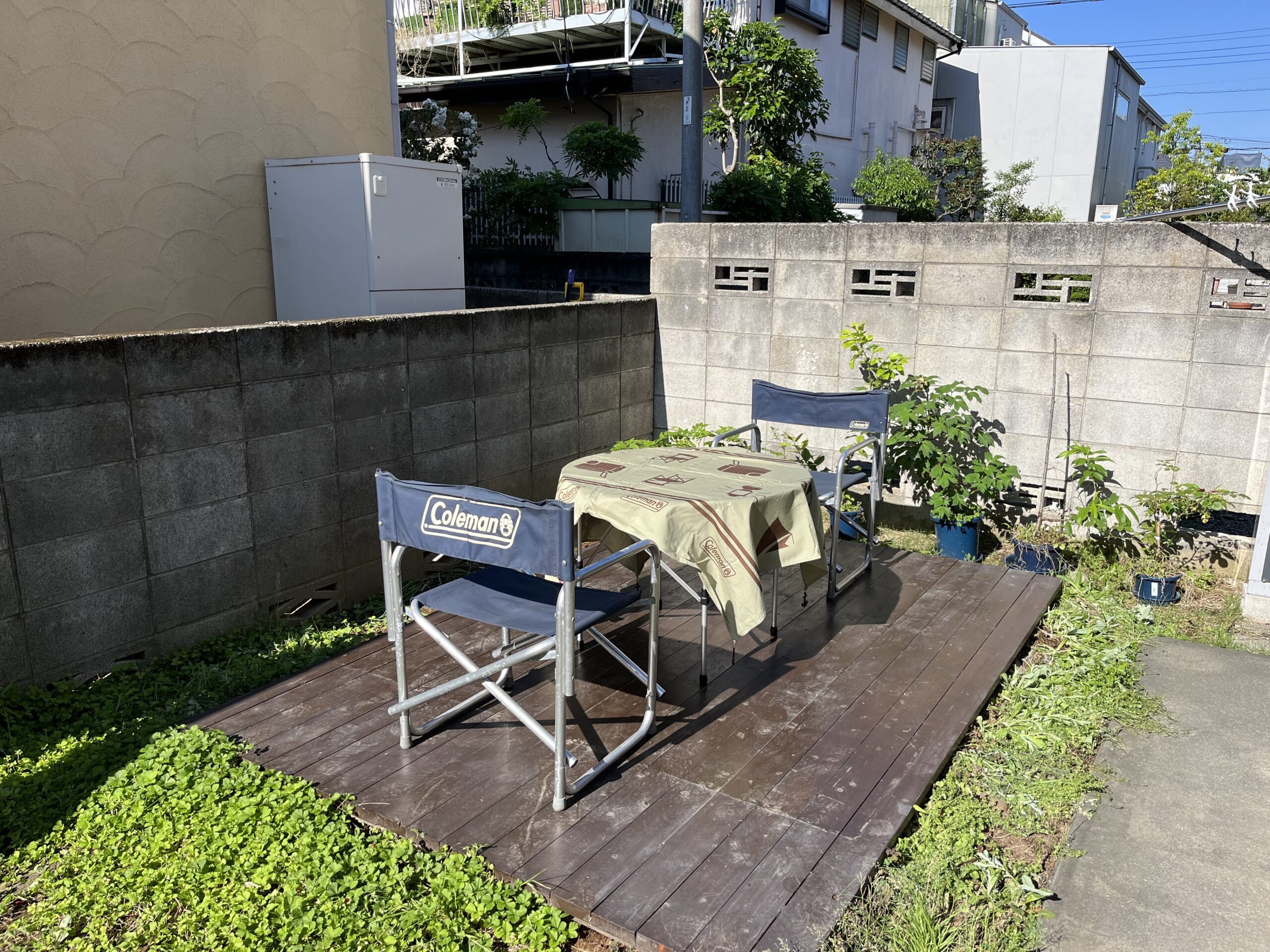 ウッドデッキにテーブルとチェアを出して、朝食をとったり、コーヒーを飲んだり、新聞を読んだり。