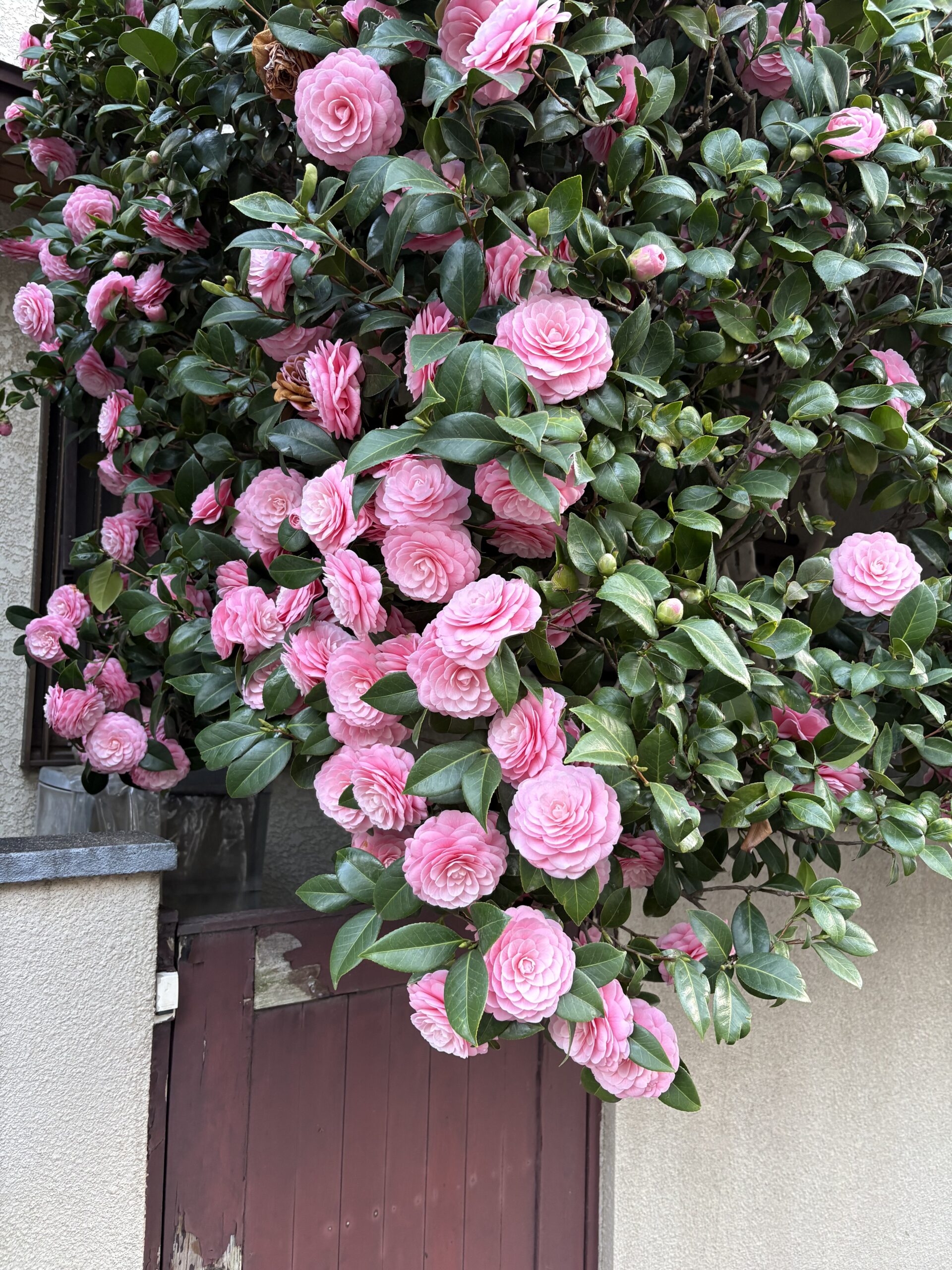 Cheerです。春になり、向かいの家の椿がキレイに咲いています。