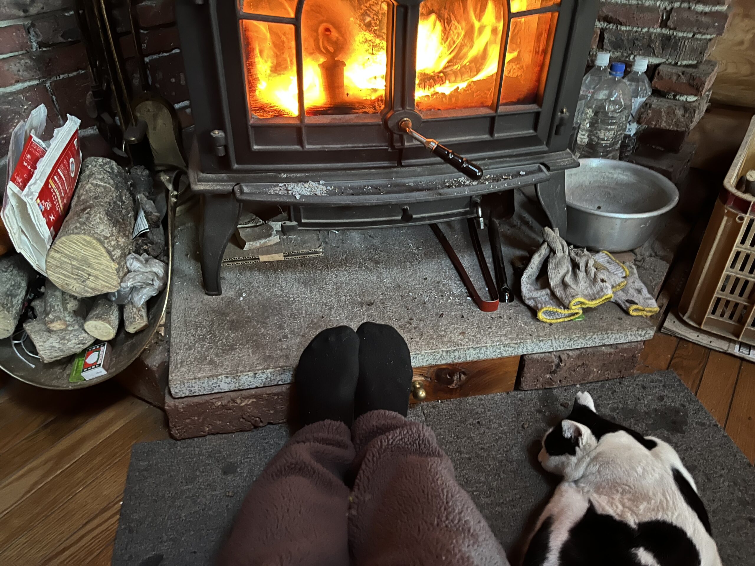 夕食にはささやかなお祝いをして、猫(捨て猫)と一緒に、薪ストーブにあたります。