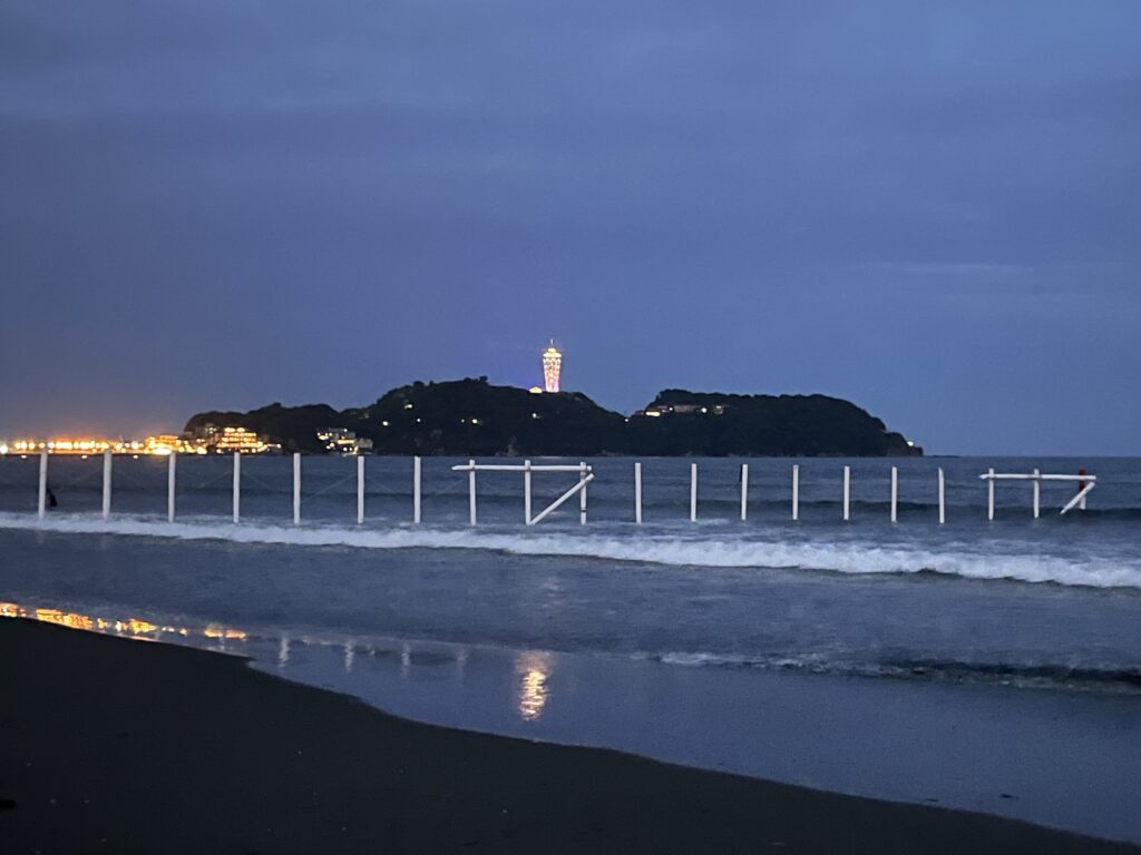 夜になると、江の島がライトアップされて、キレイです。