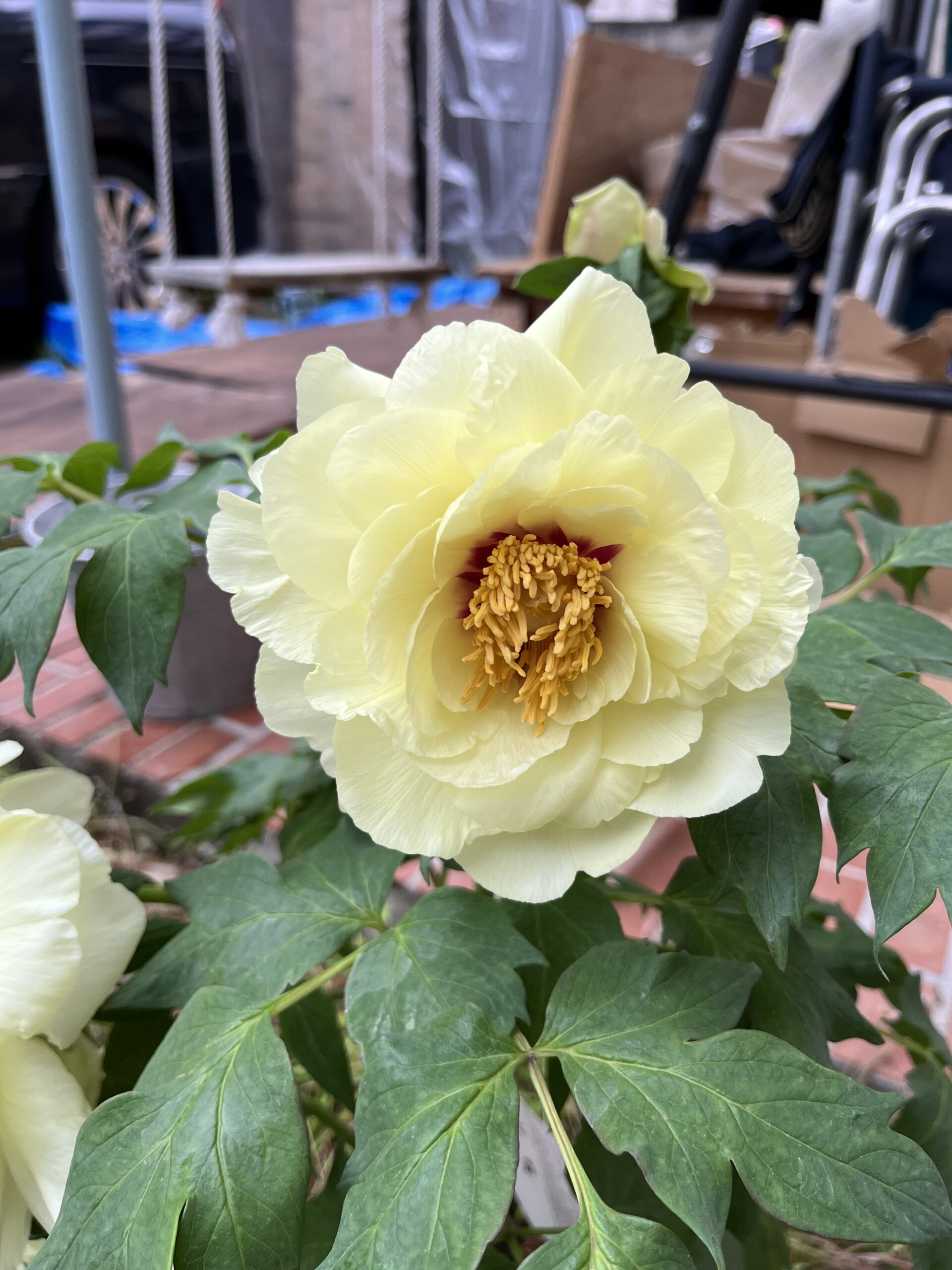 旅の準備チアです。庭の牡丹(ぼたん)が咲きました。黄冠(おうかん)という日本初の大輪の黄花牡丹です。