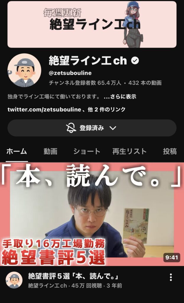 チアです。過激な川柳ですが、チャンネル登録している「絶望ライン工ch」の話です。