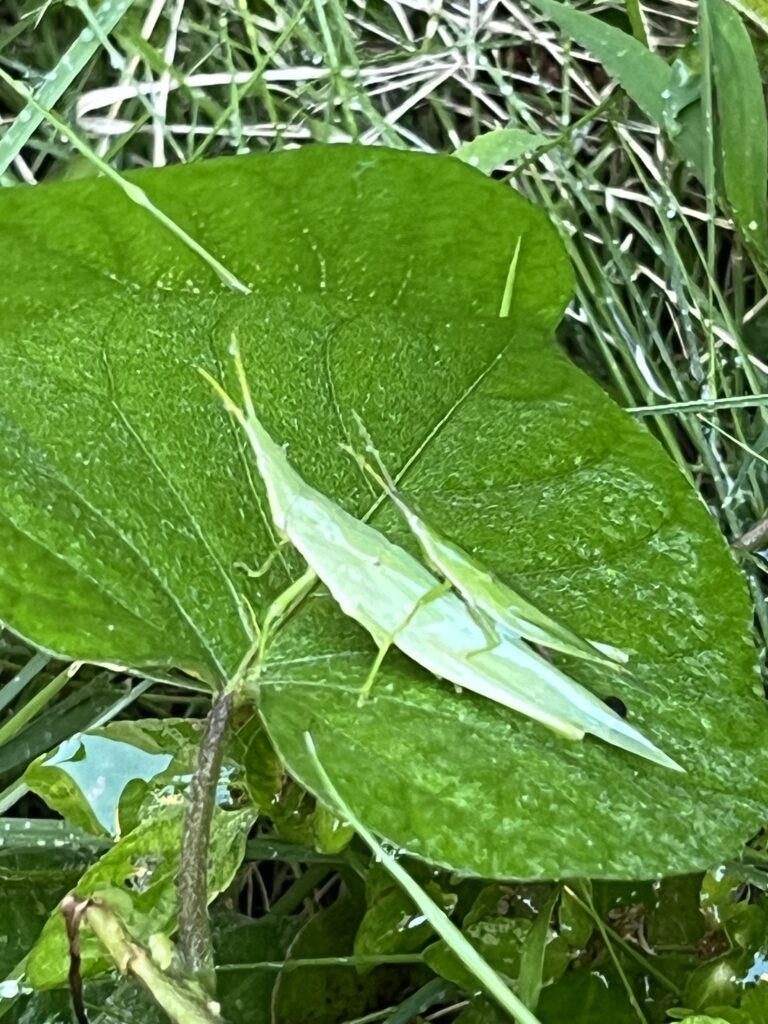 写真はバッタの親子、親の背中に子供が乗っていて可愛いです。