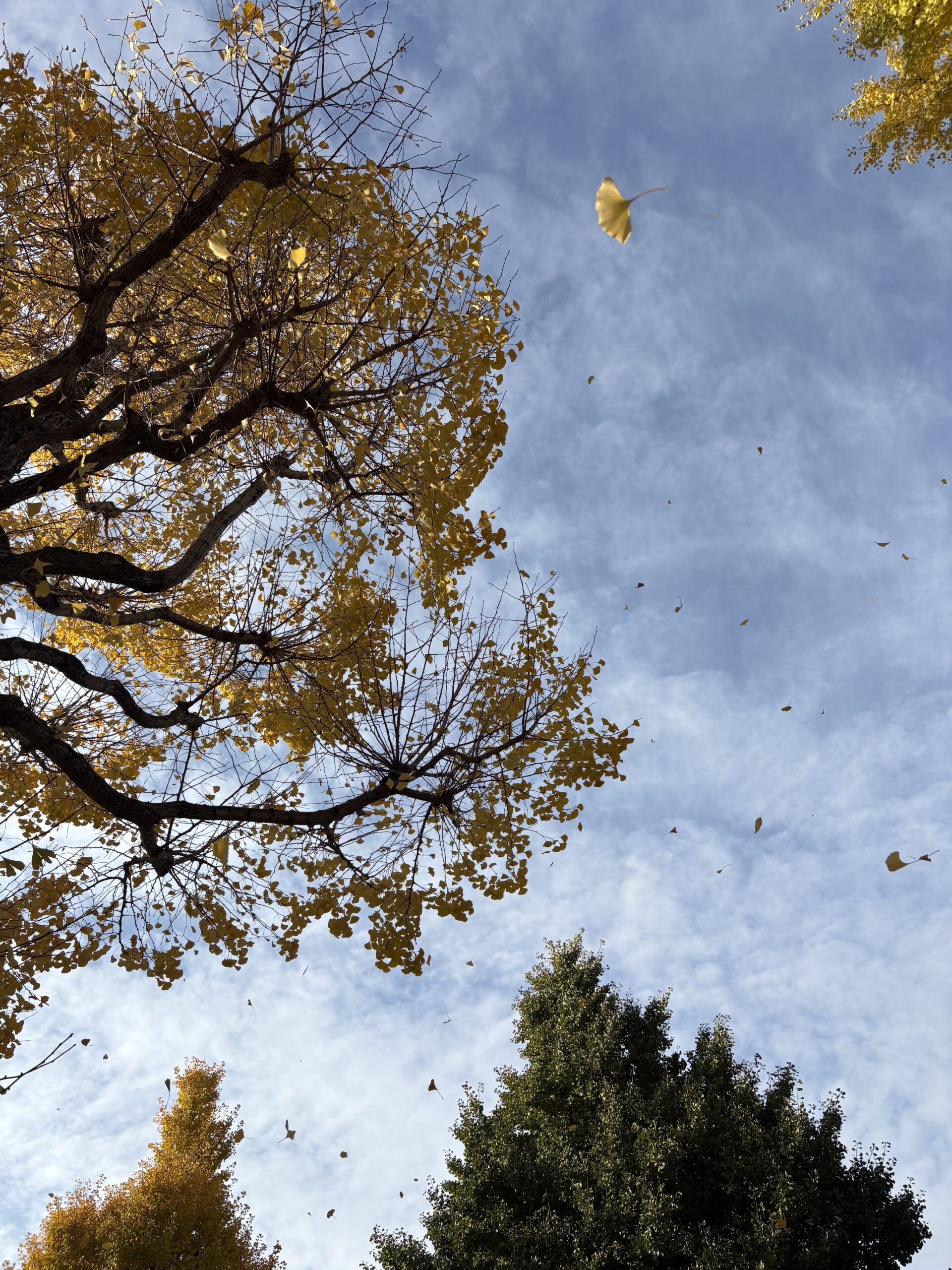 銀杏を踏まないように気をつけながら、積もったイチョウの葉っぱを踏みしめて歩きます。
